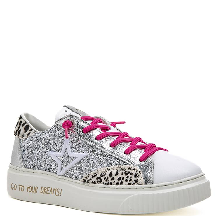 Zapatillas deportivas elaboradas en piel con glitter en color plata y detalles en animal print i plata. Cordones fucsia en contraste. Suela de goma flexible de 2 cm de altura.