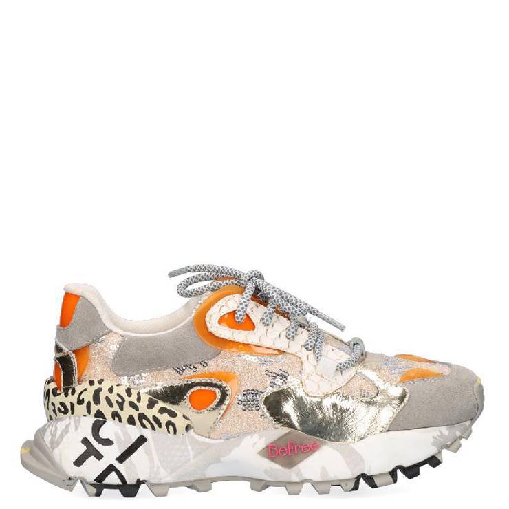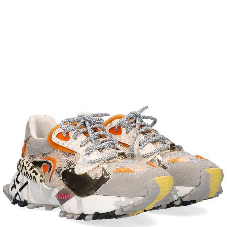 Zapatillas deportivas elaborada en combinación de diferentes materiales y colores lisos y metalizados.