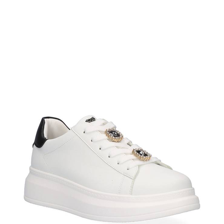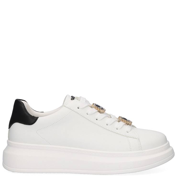 Zapatillas deportivas elaboradas en piel blanca con detalle negro en la parte trasera. Cierre con cordones. Detalle joya en los cordones.