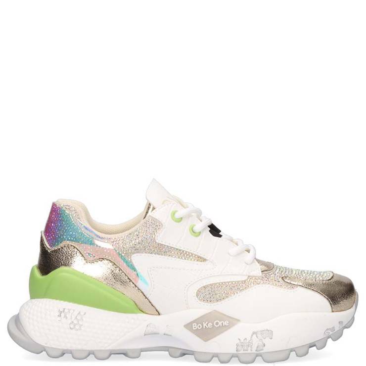 Zapatillas deportivas en combinación de materiales y texturas. Suela de goma de 4 cm de altura. Plantilla en material textil. Detalles decorativos en strass.