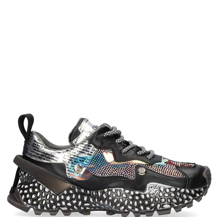 Zapatillas deportivas elaboradas en piel con brillantes y color silver. Plantilla de piel. Cuenta con cierre de cordones. Suela de goma con 4,5 cm de plataforma. Detalle decorativo en el talón.