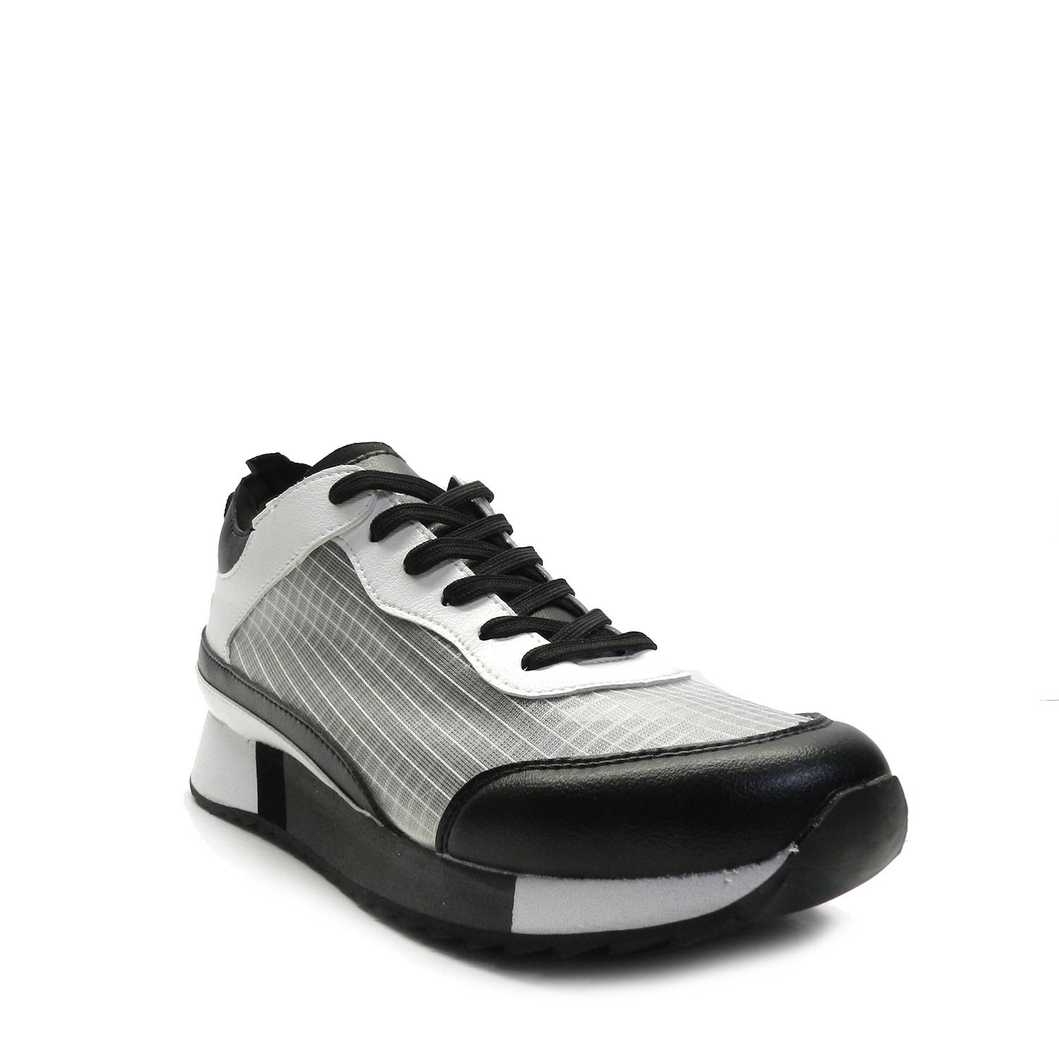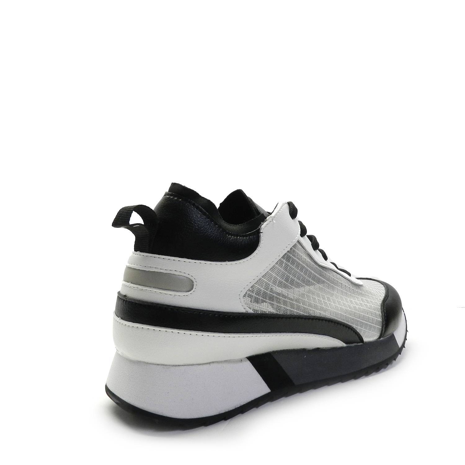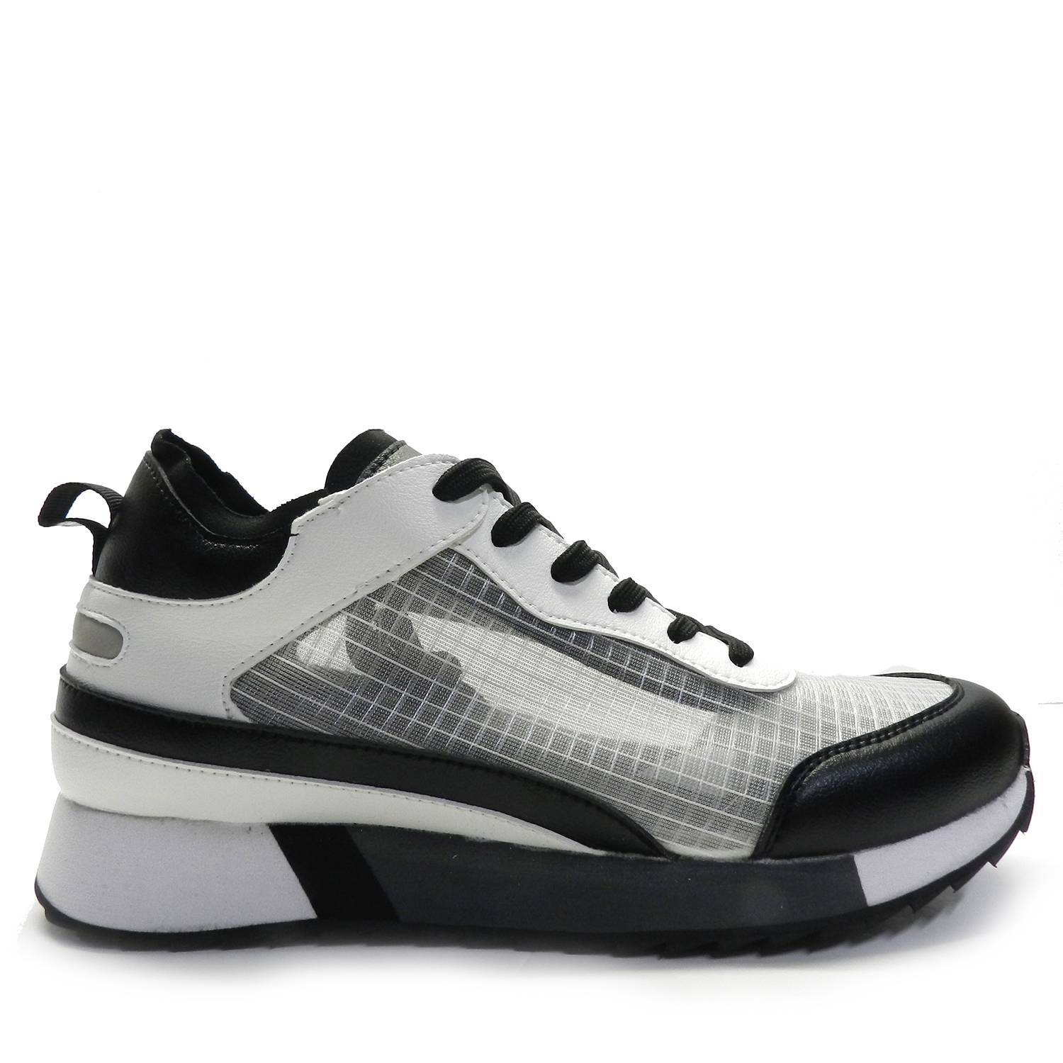 Zapatillas de la marca Francesco Milano, modelo A38-01 en color negro. Zapatilla deportiva confeccionada en textil negro con transparencias. Suela de goma blanca con cuña y detalle bicolor en la parte posterior. Cierre con cordones deportivos.