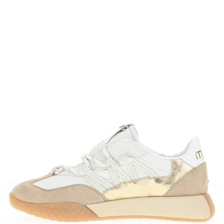 Zapatillas deportivas elaboradas en combinación de nylon, piel y ante. Detalle de cordones cruzados y lateral en piel dorada. Suela de goma bicolor.