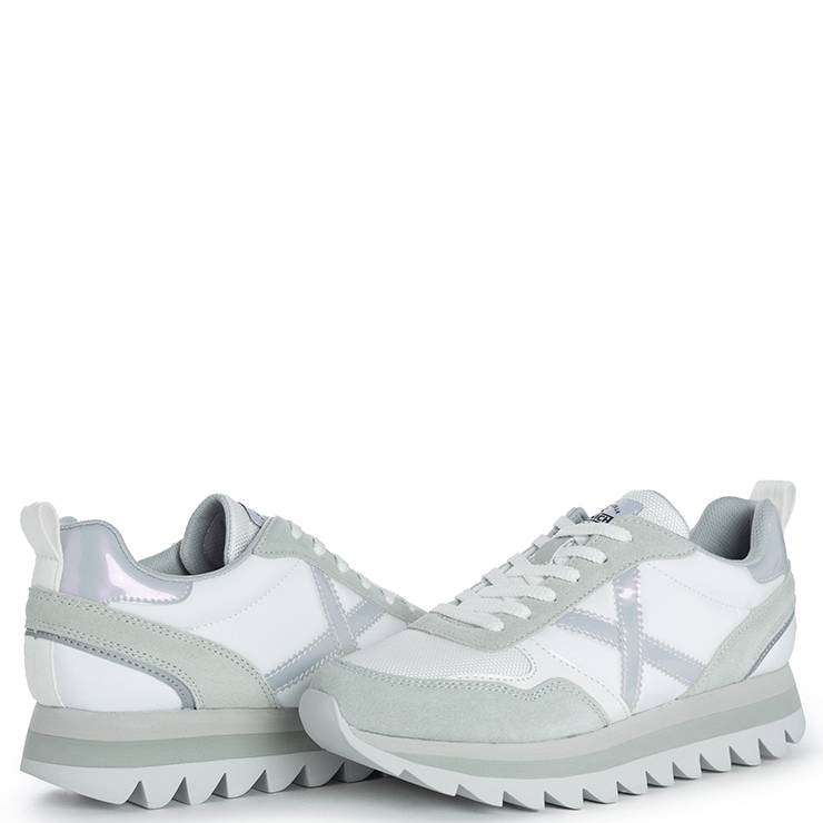 Zapatillas de la marca Munich, modelo Ripple 49. Zapatilla deportiva en color blanco con detalles en gris y blanco. Contraste de materiales, plataforma y huella dentada. Cierre mediante cordones. Altura de la suela 4 cm.