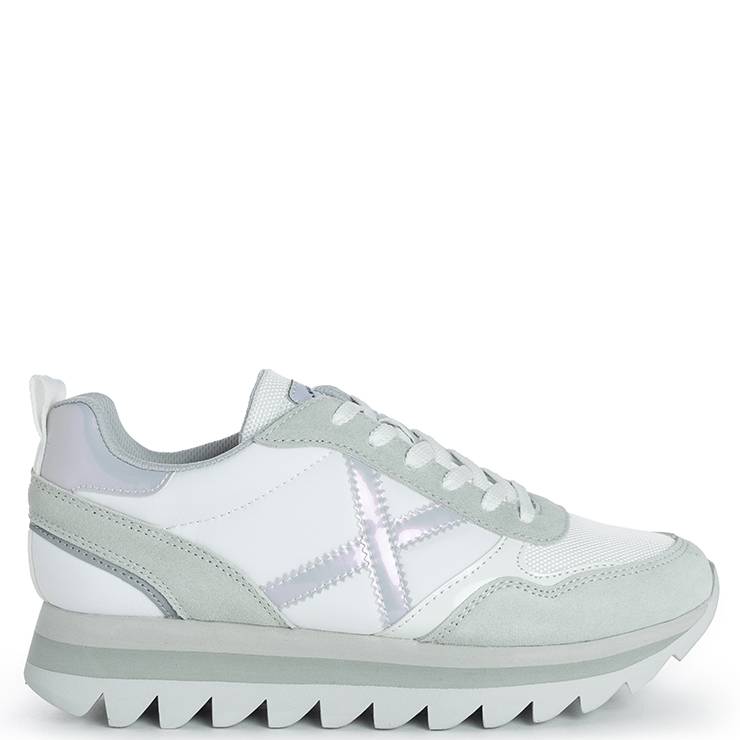 Zapatillas de la marca Munich, modelo Ripple 49. Zapatilla deportiva en color blanco con detalles en gris y blanco. Contraste de materiales, plataforma y huella dentada. Cierre mediante cordones. Altura de la suela 4 cm.