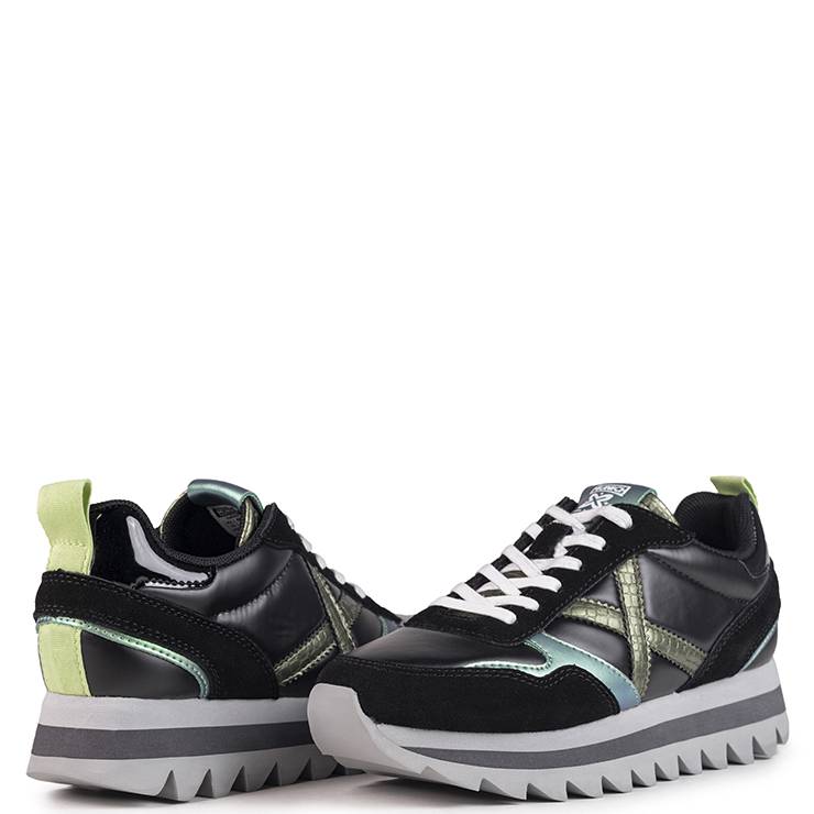 Zapatilla deportiva elaborada en combinación de materiales. Suela de goma dentada de 4 cm de altura. Cierre mediante cordones.