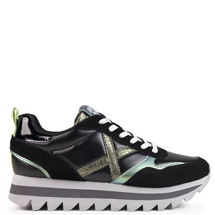 Zapatilla deportiva elaborada en combinación de materiales. Suela de goma dentada de 4 cm de altura. Cierre mediante cordones.