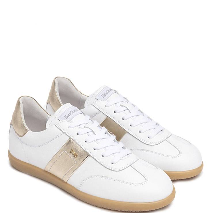Zapatillas deportivas elaboradas en piel. Detalle de franja lateral en dorado. Suela de goma de 2 cm en color caramelo. Cierre con cordones. Plantilla extraíble.