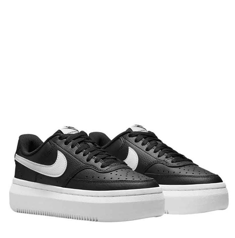 Zapatillas de la marca Nike, modelo Court Vision Alta en color negro. Zapatillas deportivas en piel negra duradera con perforaciones en la puntera. Mediasuela de espuma elevada, lengüeta ultraacolchada para mayor comodidad. Suela de goma con plataforma.