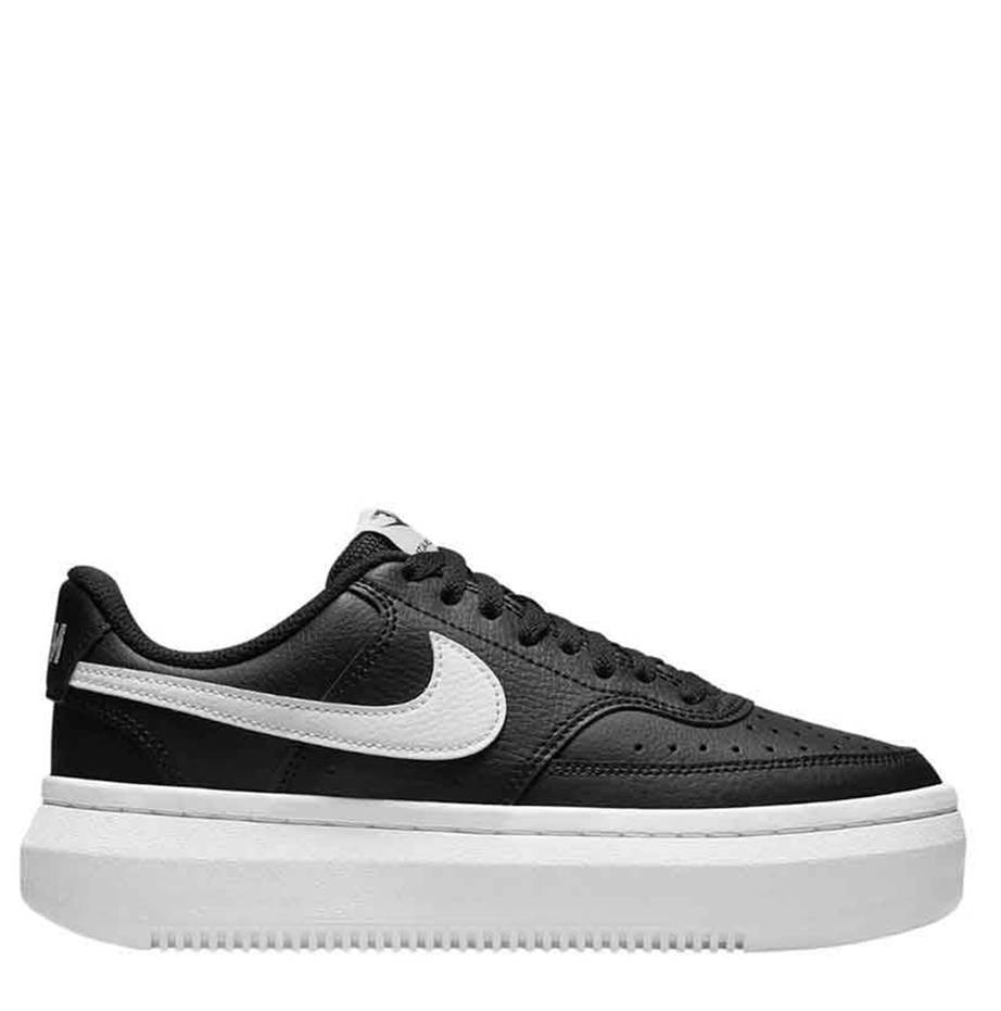 Zapatillas de la marca Nike, modelo Court Vision Alta en color negro. Zapatillas deportivas en piel negra duradera con perforaciones en la puntera. Mediasuela de espuma elevada, lengüeta ultraacolchada para mayor comodidad. Suela de goma con plataforma.