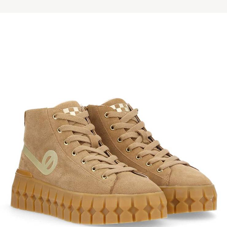 Zapatillas deportivas abotinadas en piel de ante detalle de logo retro dorados en los laterales y el talón. Maxi suela dentada de color miel. Forro textil de poliéster. Plantilla extraíble de algodón orgánico. Cierre con cordones planos.