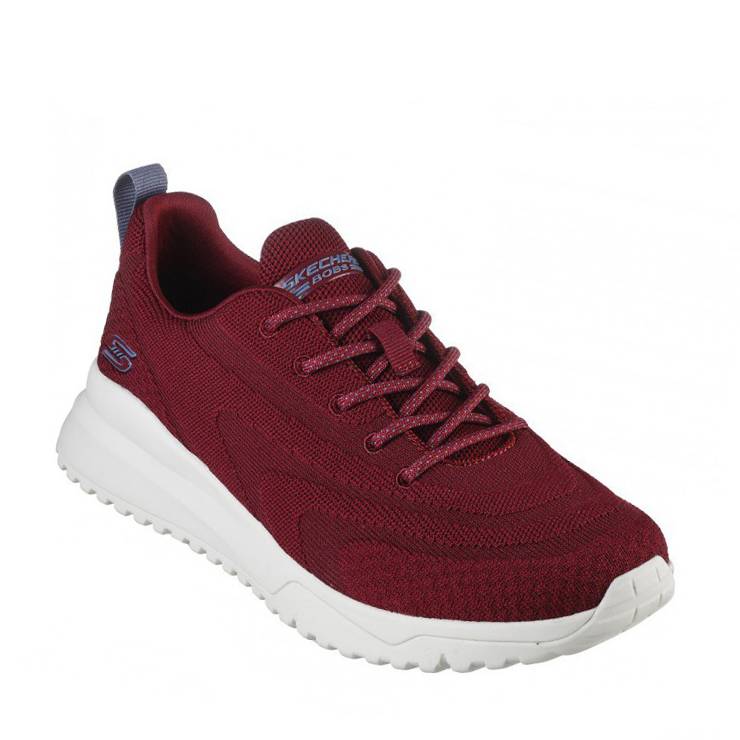 Zapatillas de la marca Skechers, modelo 117187 en color granate. Zapatilla deportiva en tejido suave knit deportivo Tough Talk. Plantilla Memory Foam Air Cooled. Detalle de logotipo en el panel lateral. Cuello y lengüeta acolchados. Forro de tela suave. Suela blanca de goma. Cierre con cordones.