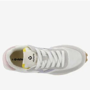 Zapatillas de la marca Victoria, modelo 138100 en color blanco y lila. Zapatillas deportivas de nylon en color blanco en combinado con piezas efecto serraje en gris. Logotipo retro en lila en el lateral. Cierre mediante cordones blancos y suela ligera dentada para un mejor agarre.