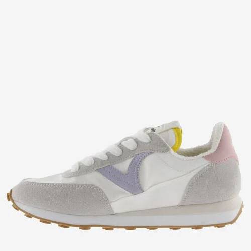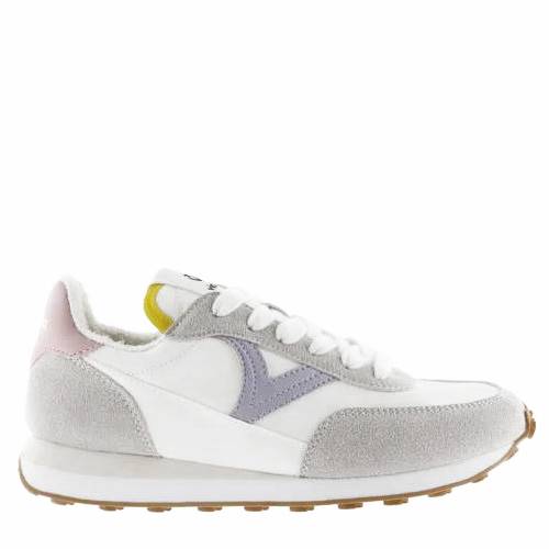 Zapatillas de la marca Victoria, modelo 138100 en color blanco y lila. Zapatillas deportivas de nylon en color blanco en combinado con piezas efecto serraje en gris. Logotipo retro en lila en el lateral. Cierre mediante cordones blancos y suela ligera dentada para un mejor agarre.