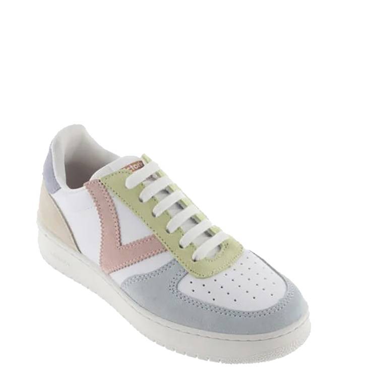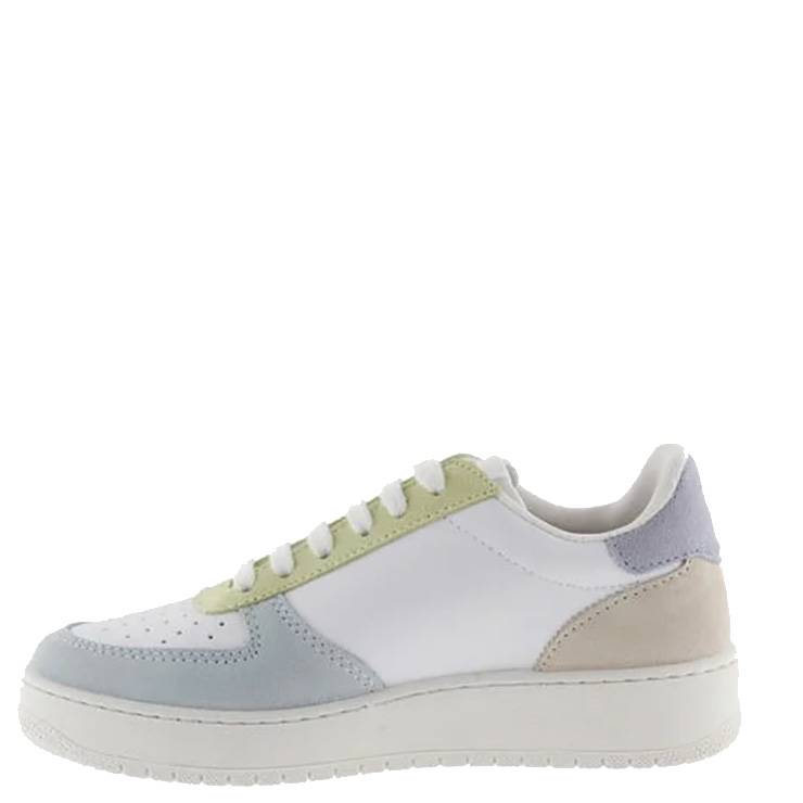 Zapatillas deportivas elaboradas en material blanco efecto piel y piezas de serraje en colores pastel.