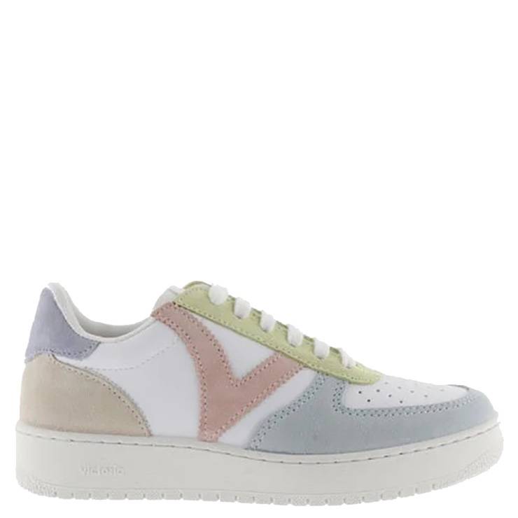 Zapatillas deportivas elaboradas en material blanco efecto piel y piezas de serraje en colores pastel.