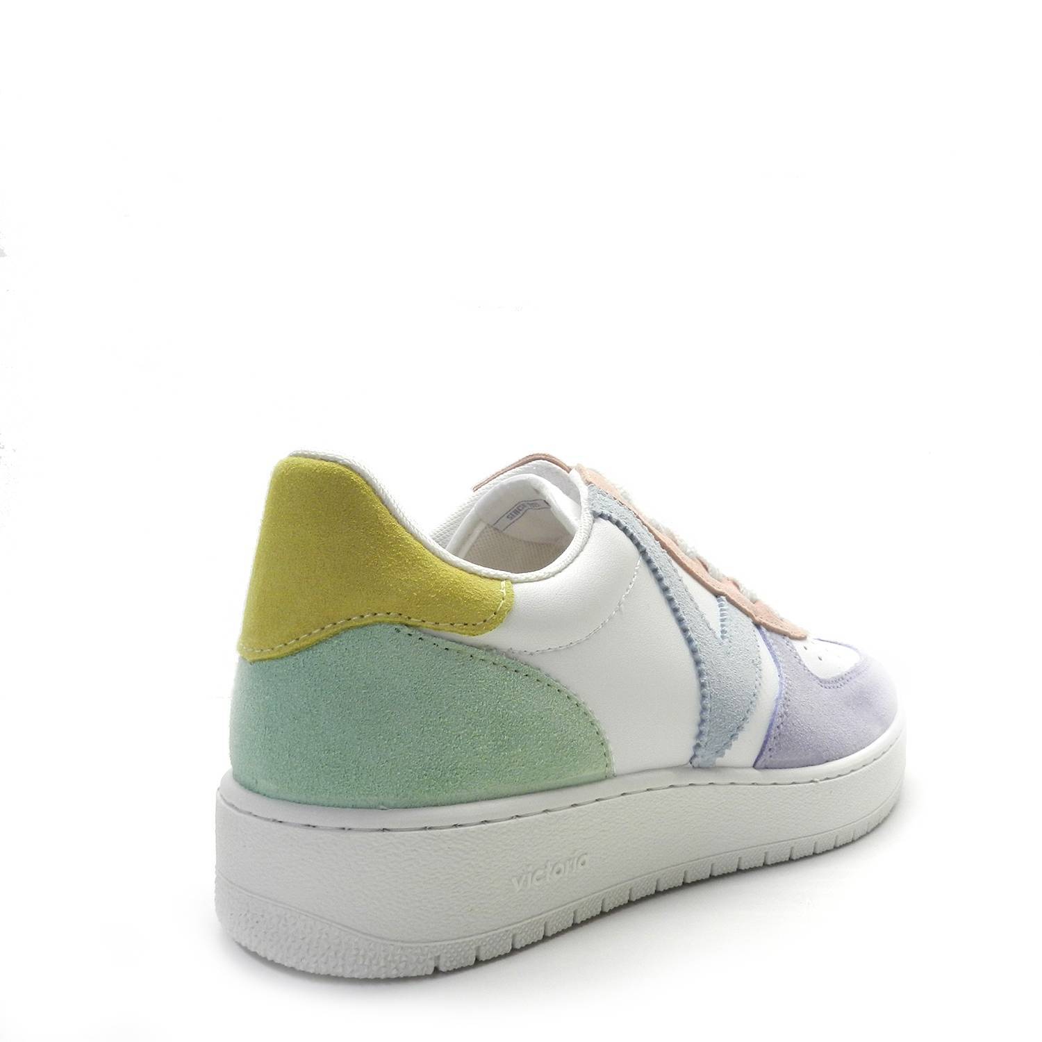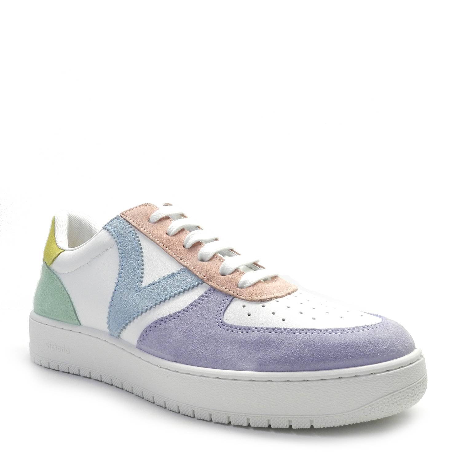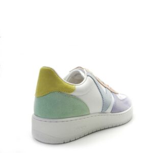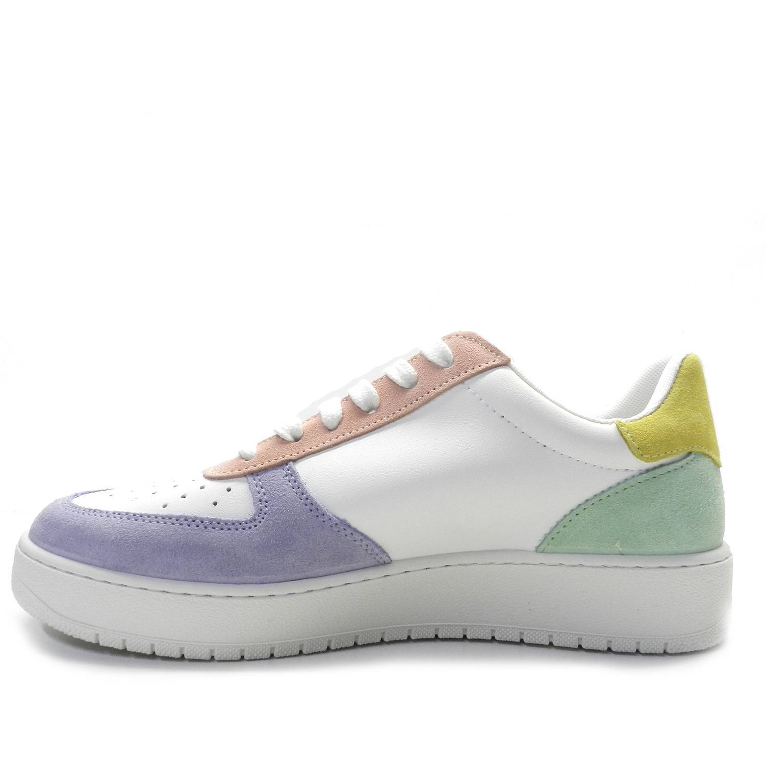 Zapatillas deportivas elaboradas en material blanco efecto piel y piezas de serraje en colores pastel.
