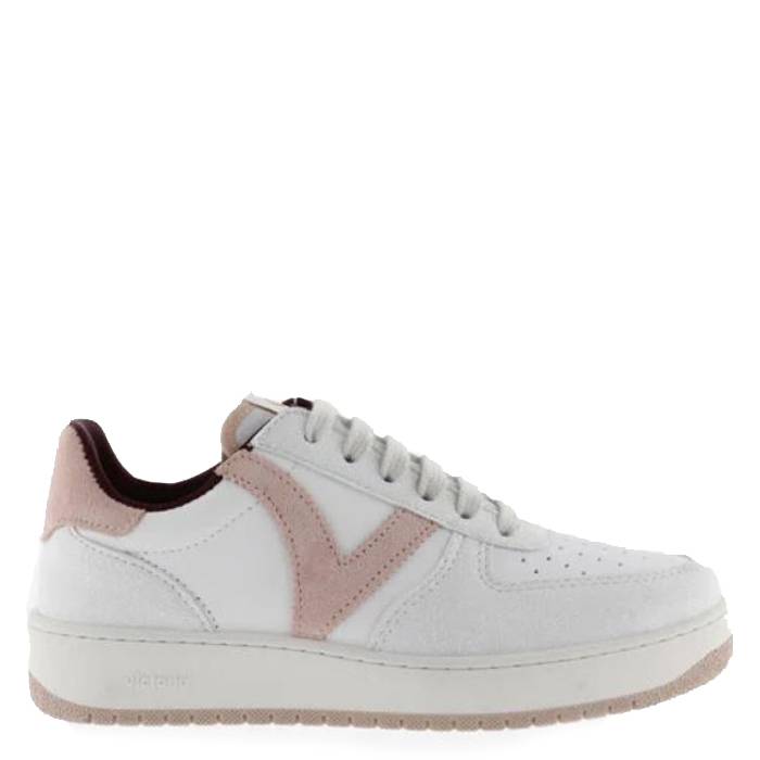 Zapatillas de la marca Victoria, modelo Madrid. Zapatillas deportivas de piel de color blanco, con logo en el lateral en color nude interior granate y puntera perforada para favorecer la transpiración. Suela gruesa de gran comodidad.