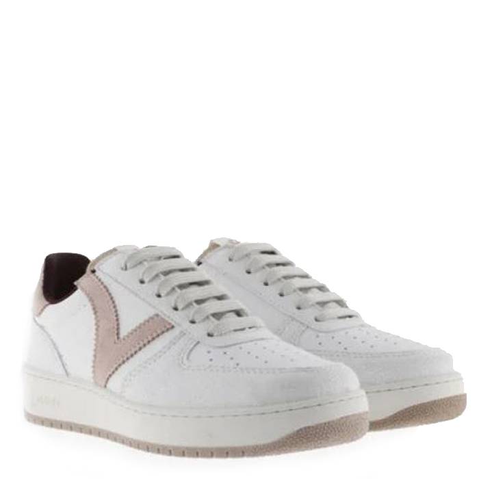 Zapatillas de la marca Victoria, modelo Madrid. Zapatillas deportivas de piel de color blanco, con logo en el lateral en color nude interior granate y puntera perforada para favorecer la transpiración. Suela gruesa de gran comodidad.