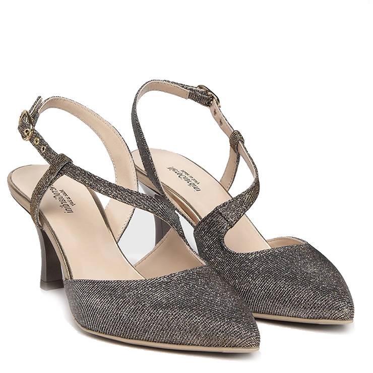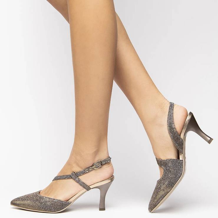 Zapato abierto en la parte trasera y con punta en la parte delantera elaborado en tejido brillante. Tira ajustable al tobillo con hebilla. Tacón de 7 cm de altura.