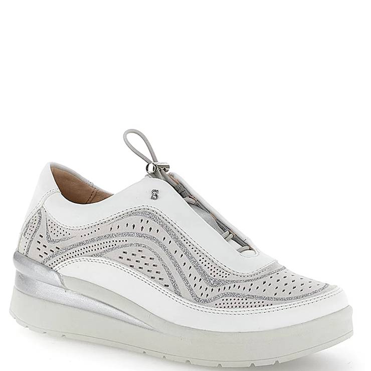 Zapato deportivo elaborado en cuero sintético con detalle en glitter. Cordones elásticos en el empeine. Parte superior perforada para mayor frescura. Tecnología Blusoft® aporta comodidad y amortiguación. Suela de goma EVA de 5 cm de altura.