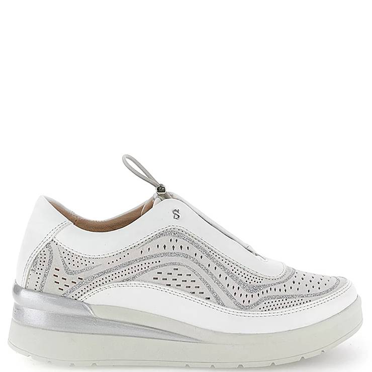 Zapato deportivo elaborado en cuero sintético con detalle en glitter. Cordones elásticos en el empeine. Parte superior perforada para mayor frescura. Tecnología Blusoft® aporta comodidad y amortiguación. Suela de goma EVA de 5 cm de altura.
