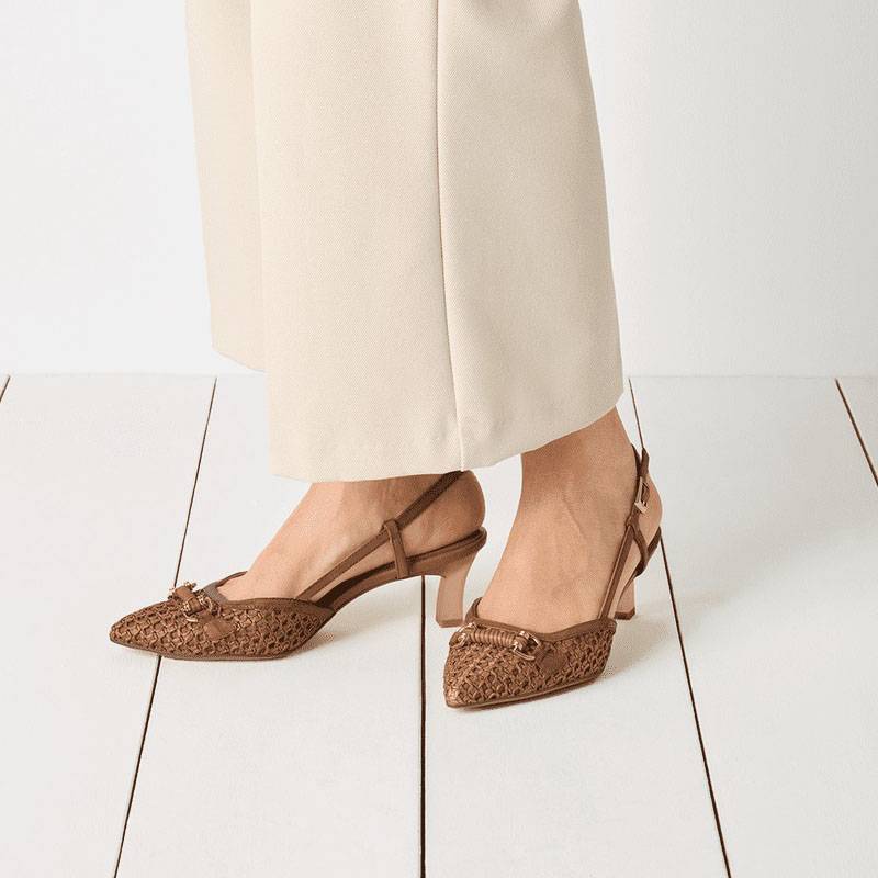Zapato tipo salón destalonada en piel sintética. Tacón de aguja de 5,5 cm. Punta afilada. Cierre ajustable con hebilla en el tobillo. Suela de goma. Detalle dorado en el empeine.