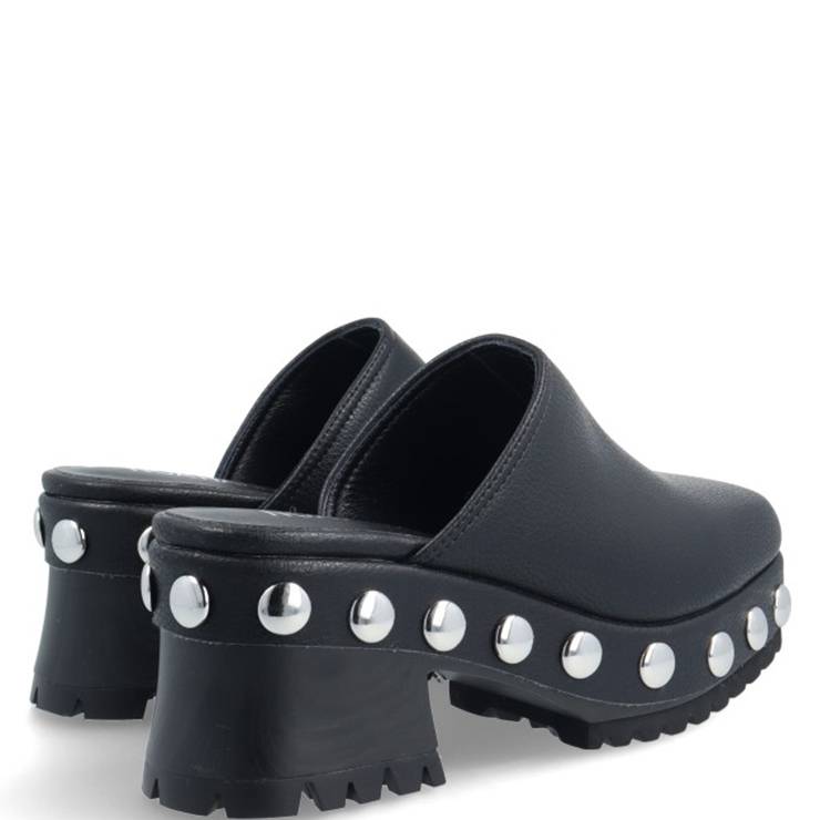 Zueco elaborado en napa. Suela track de goma. Tachas plateadas en el contorno. Tacón bloque de 3 cm de altura.